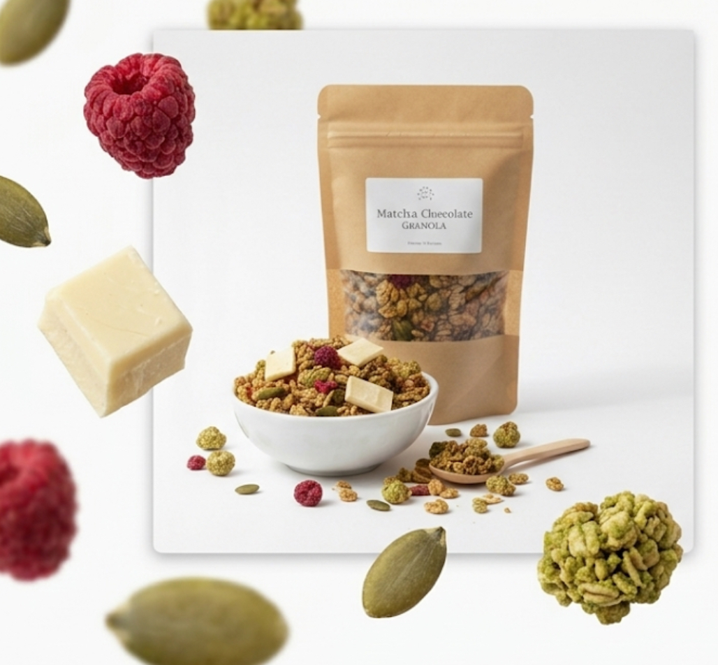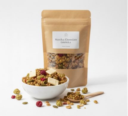 Nuestra Granola de Matcha y Chocolate Blanco es el equilibrio definitivo entre la energía terrenal del té japonés y la indulgencia cremosa del cacao blanco. Horneada lentamente para lograr un crujido artesanal, cada bocado combina la intensidad del matcha de grado ceremonial con trozos de chocolate blanco premium que se funden en el paladar. Es una explosión de texturas y contrastes, donde el perfil umami del té eleva el dulzor lácteo del chocolate, creando un desayuno o snack sofisticado, alto en fibra y cargado de antioxidantes. Ideal para transformar tu bol de yogur o leche en una experiencia gourmet vibrante que te mantiene activo y satisfecho sin renunciar al placer.